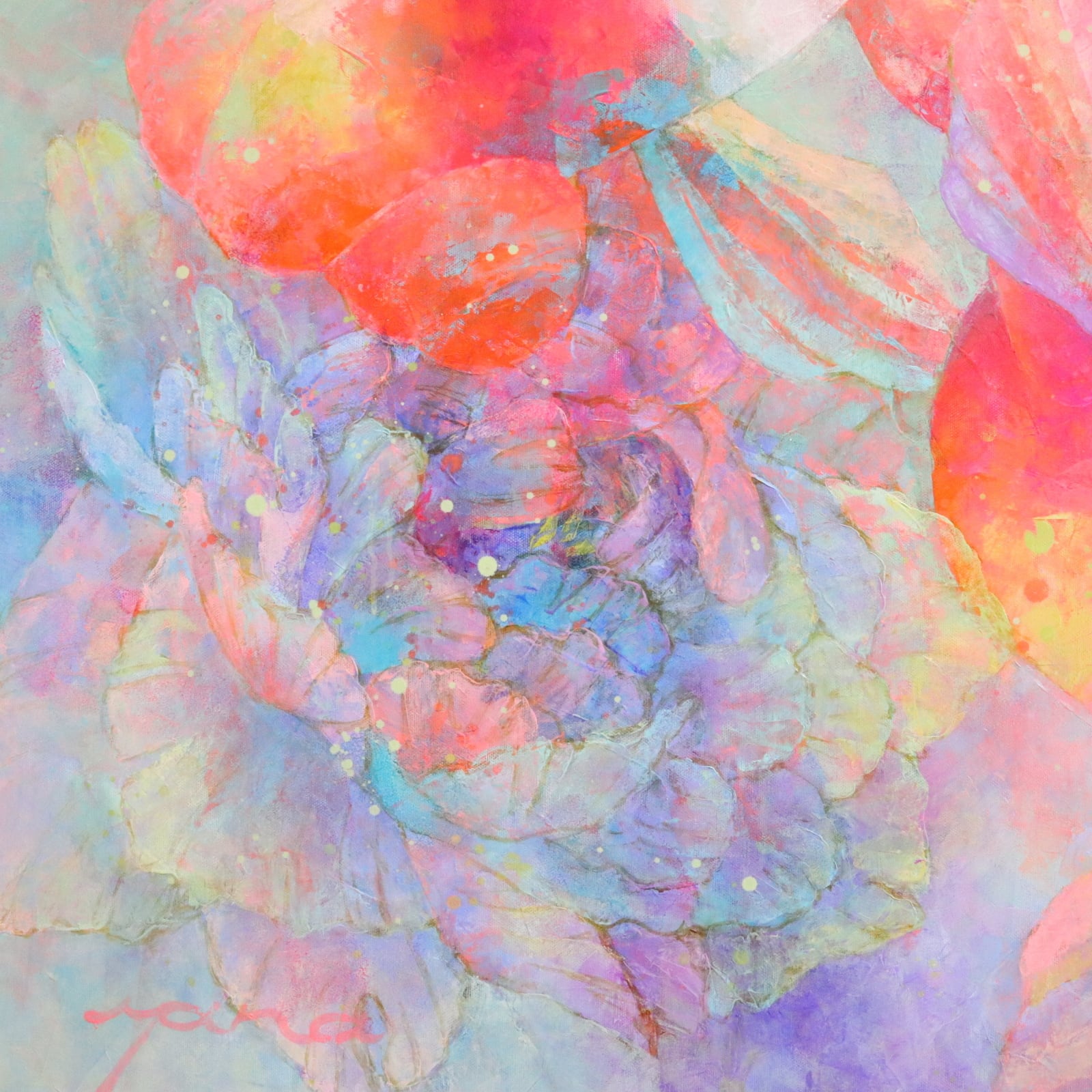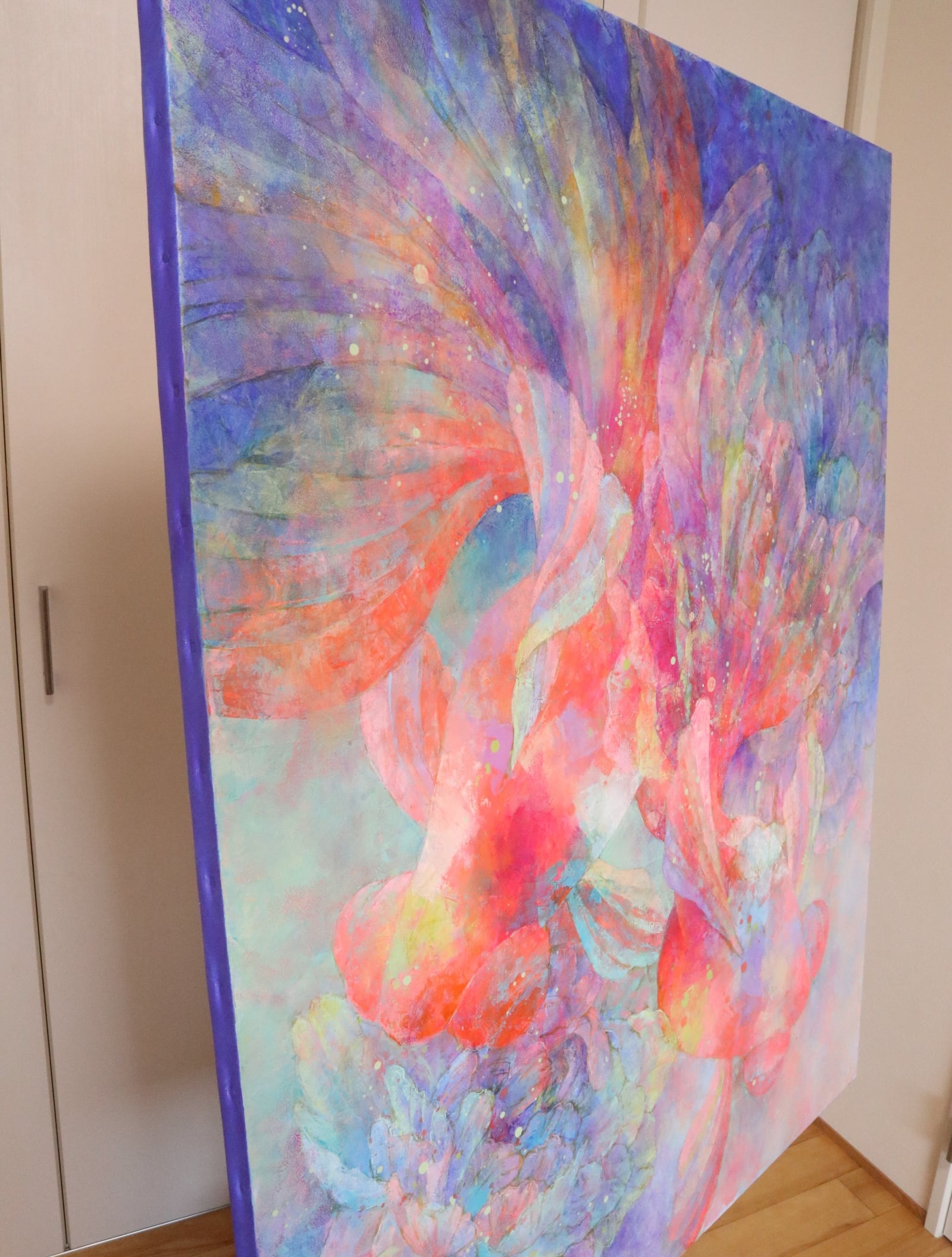 薄く溶いた油絵具を何層にも重ねて描き、最後にローラーを使い色を重ねて深みを出しました。色の重なりの美しさを感じていただけたら、嬉しいです。