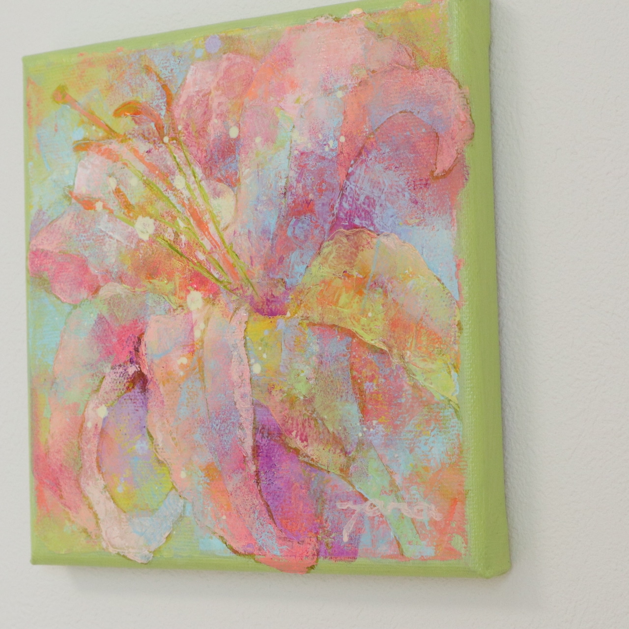 薄く溶いた油絵具を何層にも重ねて描き、最後にローラーを使い色を重ねて深みを出しました。色の重なりの美しさを感じていただけたら、嬉しいです。