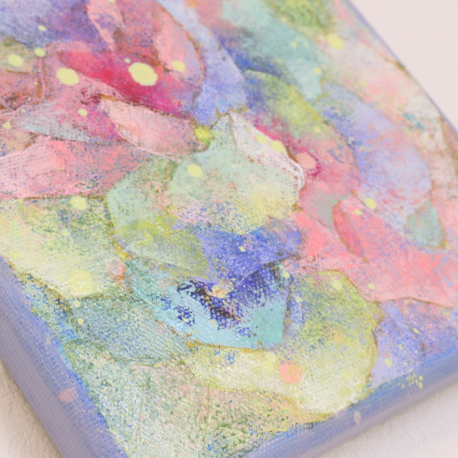 薄く溶いた油絵具を何層にも重ねて描き、最後にローラーを使い色を重ねて深みを出しました。色の重なりの美しさを感じていただけたら、嬉しいです。