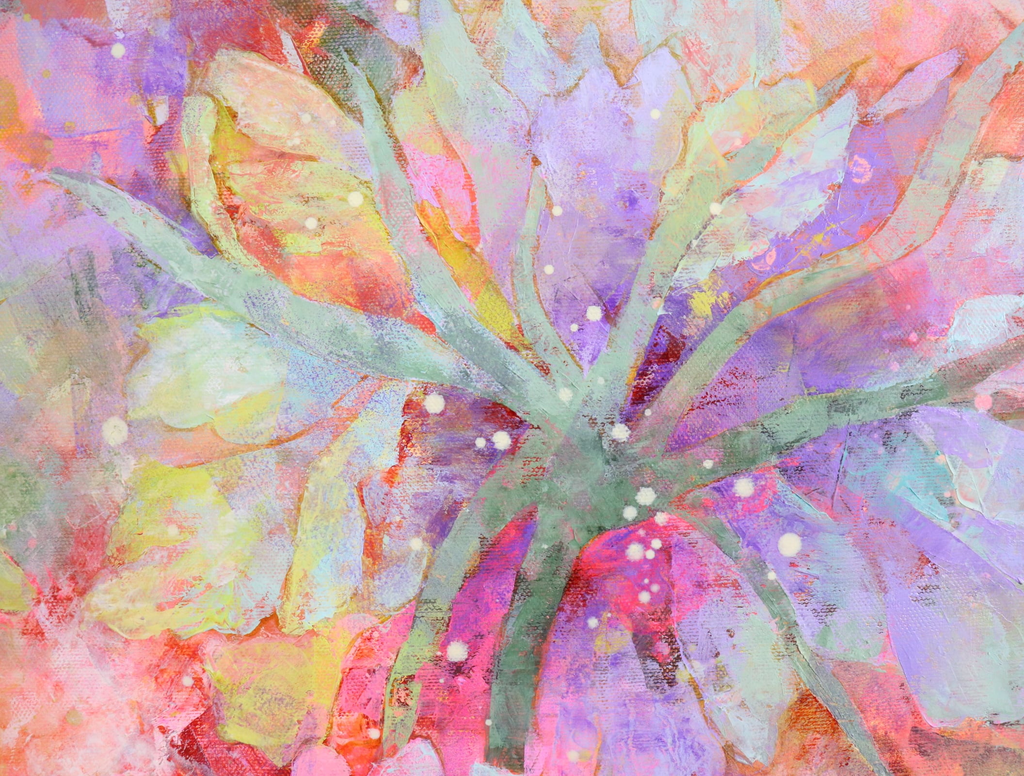 薄く溶いた油絵具を何層にも重ねて描き、最後にローラーを使い色を重ねて深みを出しました。色の重なりの美しさを感じていただけたら、嬉しいです。