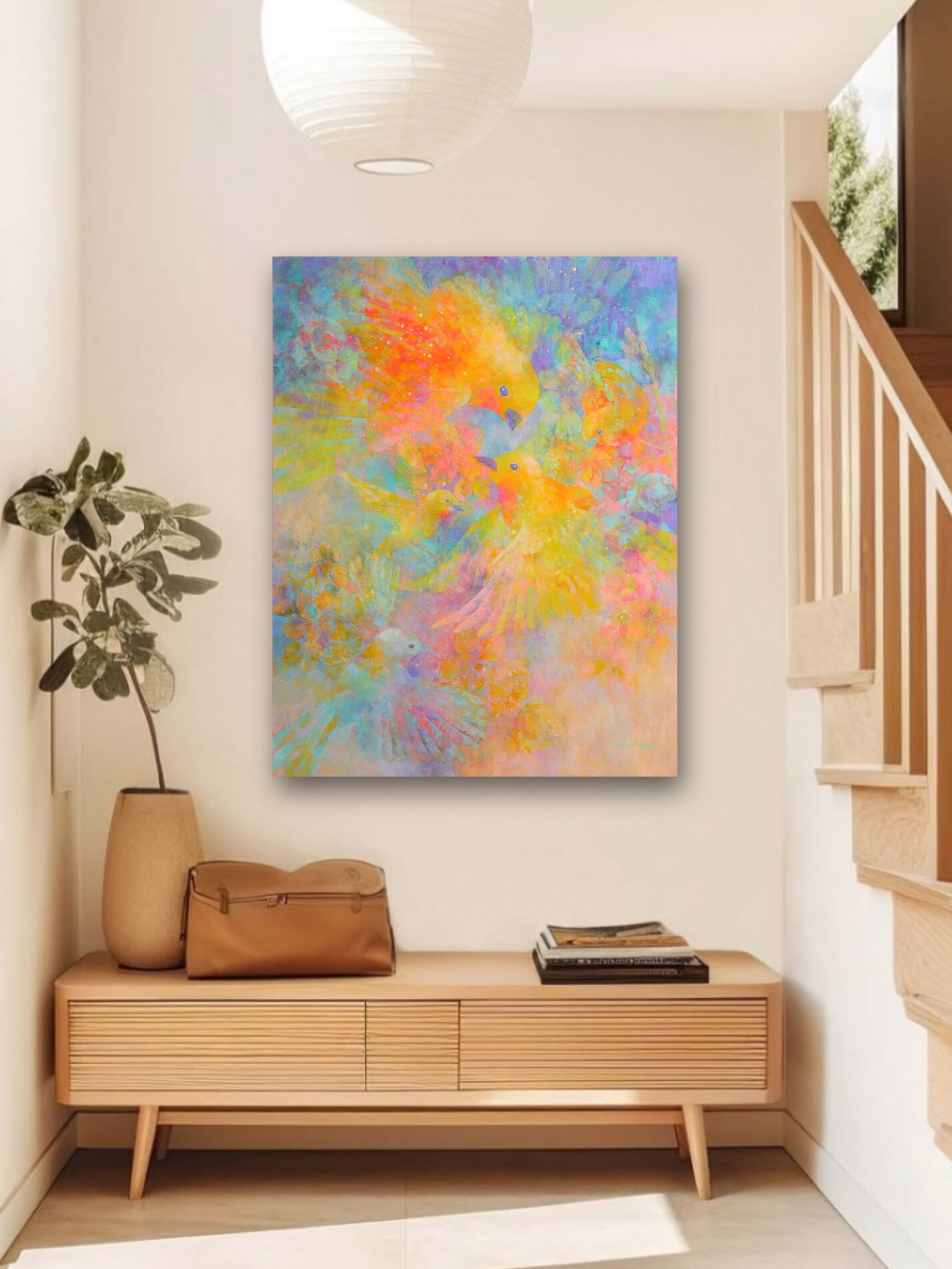 公募展用に描いた作品です。小鳥と桜のスケッチを元に半抽象画に仕上げました。