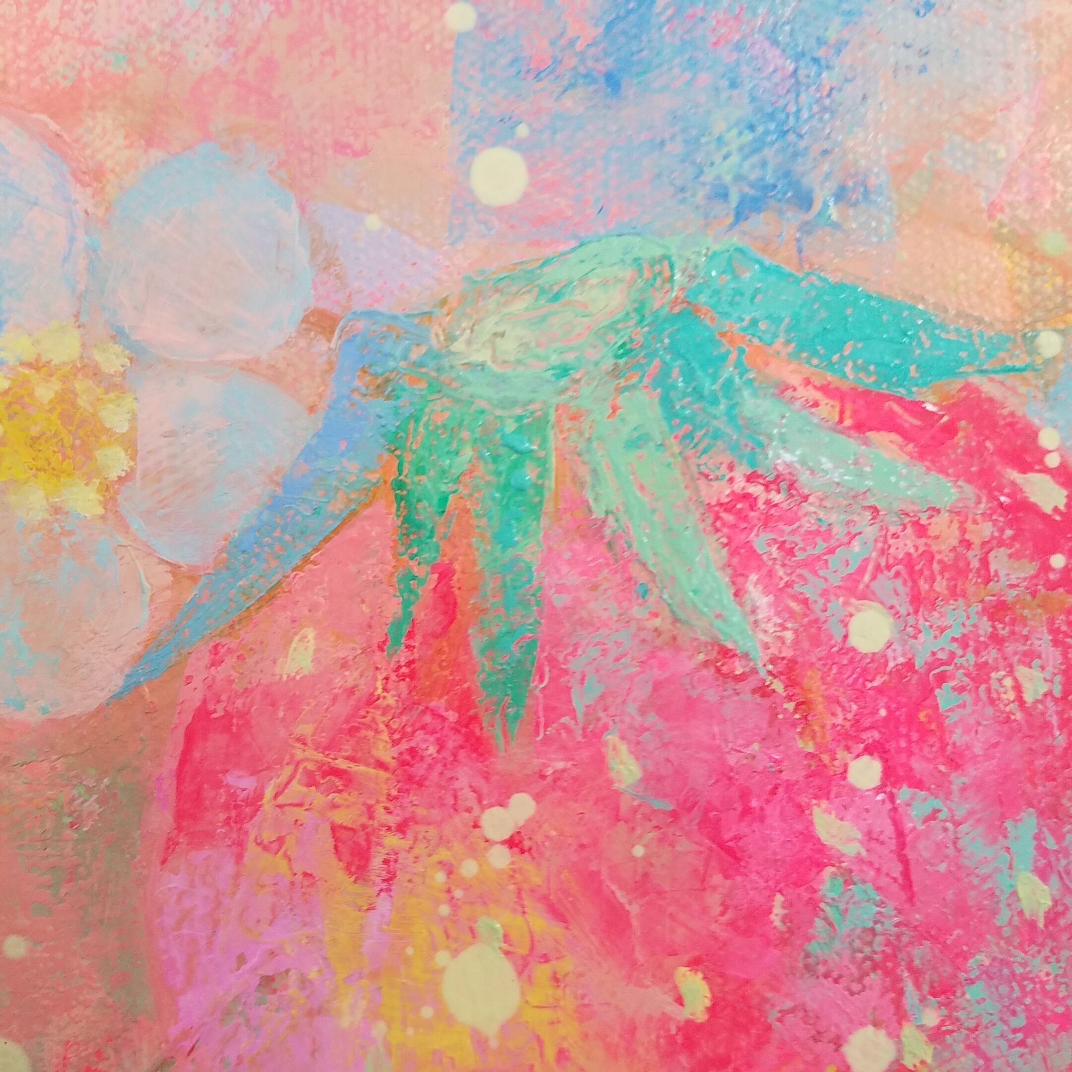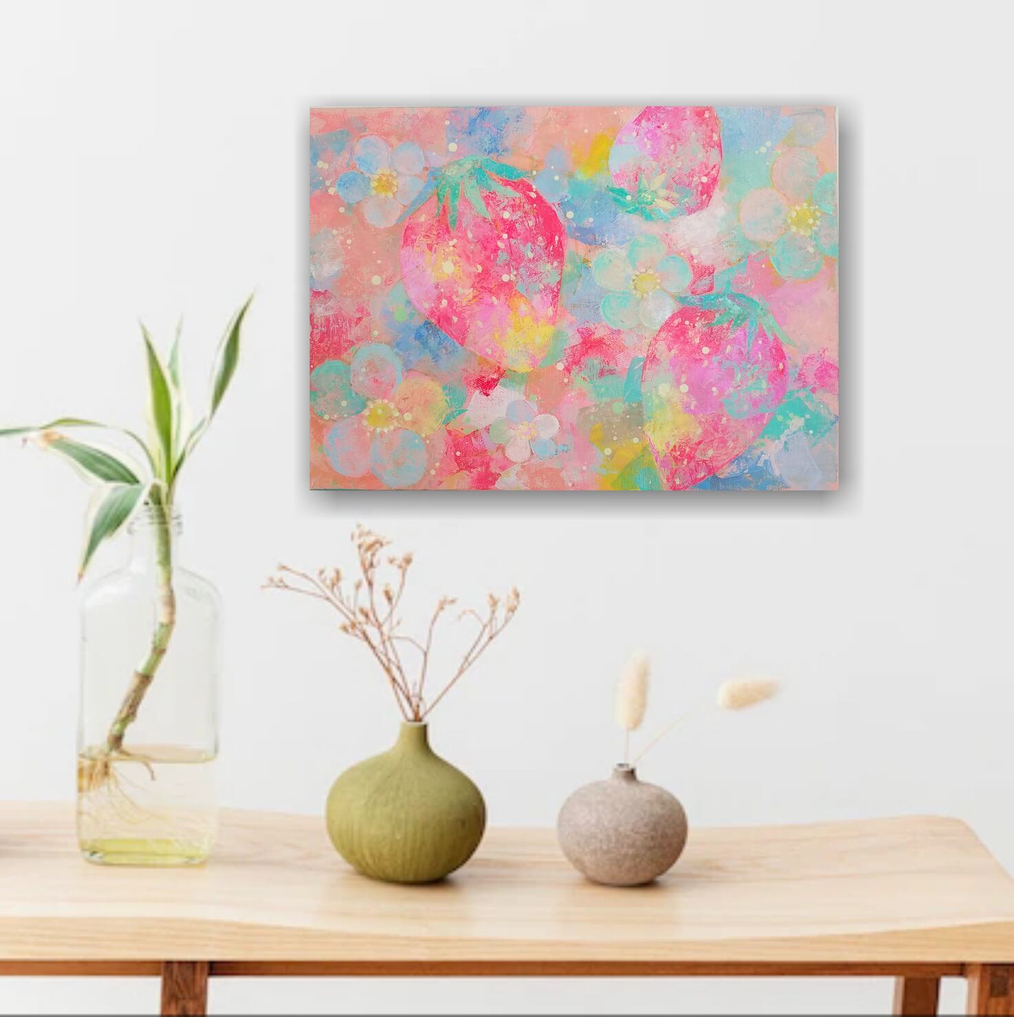 苺のモチーフを元に半抽象画に仕上げました。 お部屋がぱっと明るくなる可愛い雰囲気の作品です。