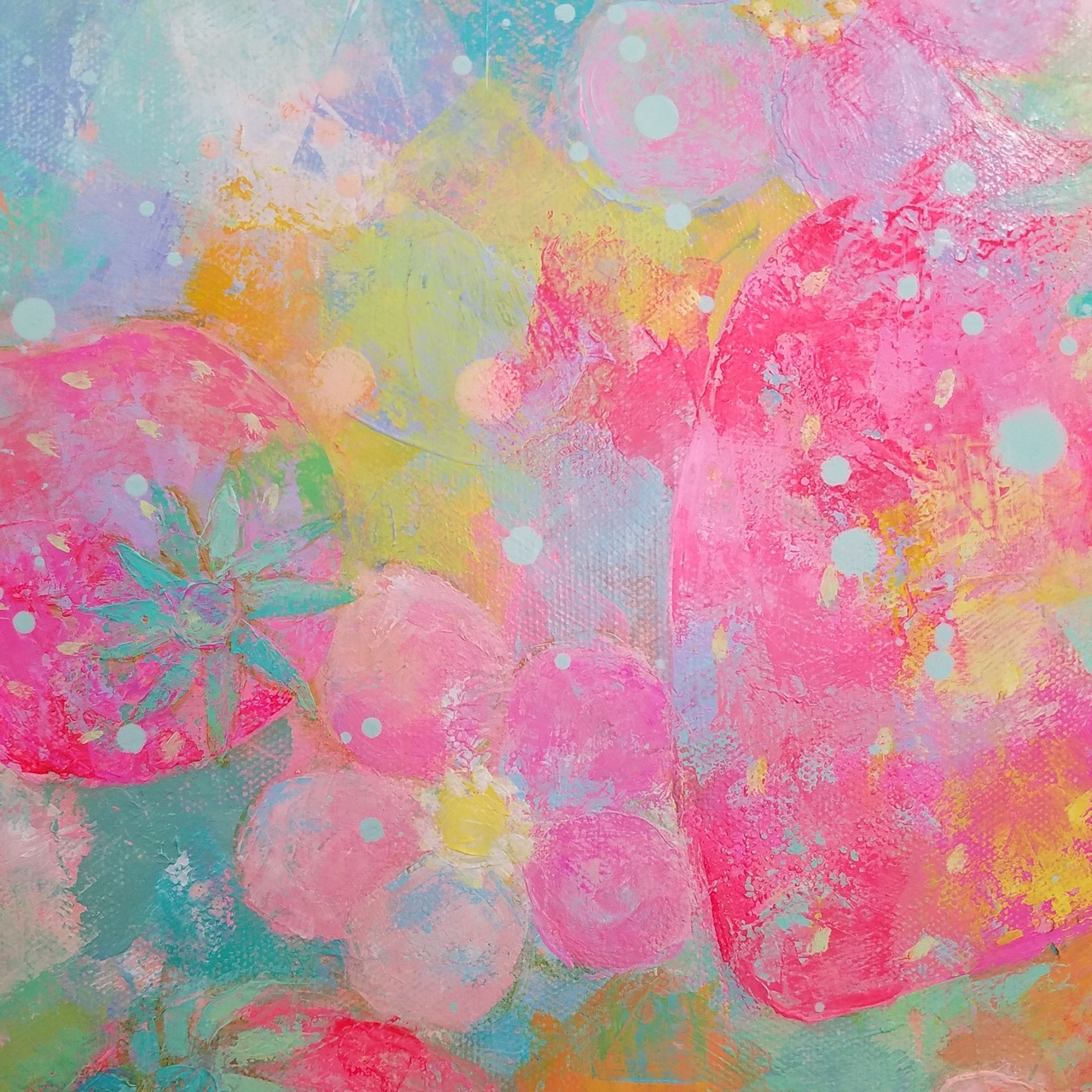 苺のモチーフを元に半抽象画に仕上げました。 お部屋が明るくなる可愛い雰囲気の作品です。