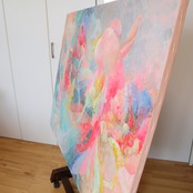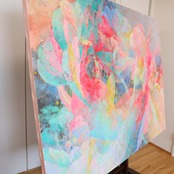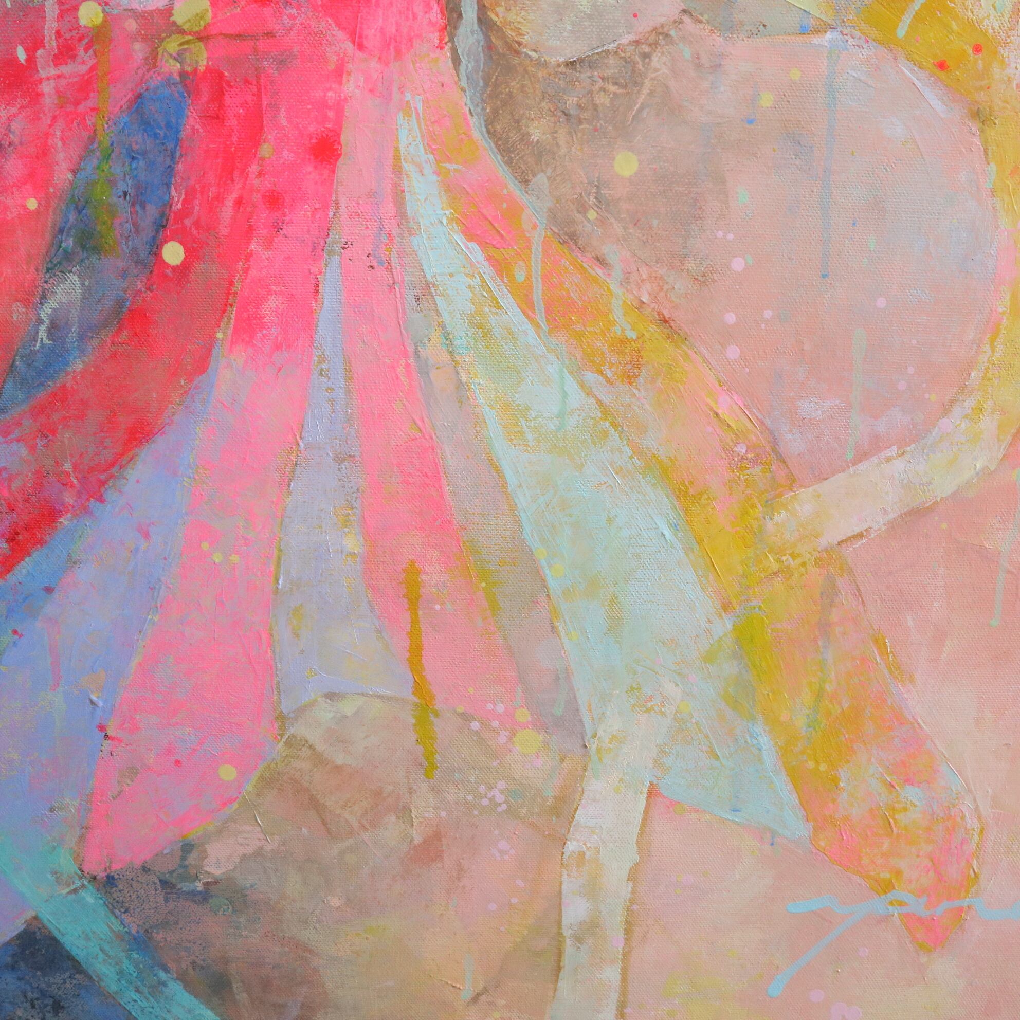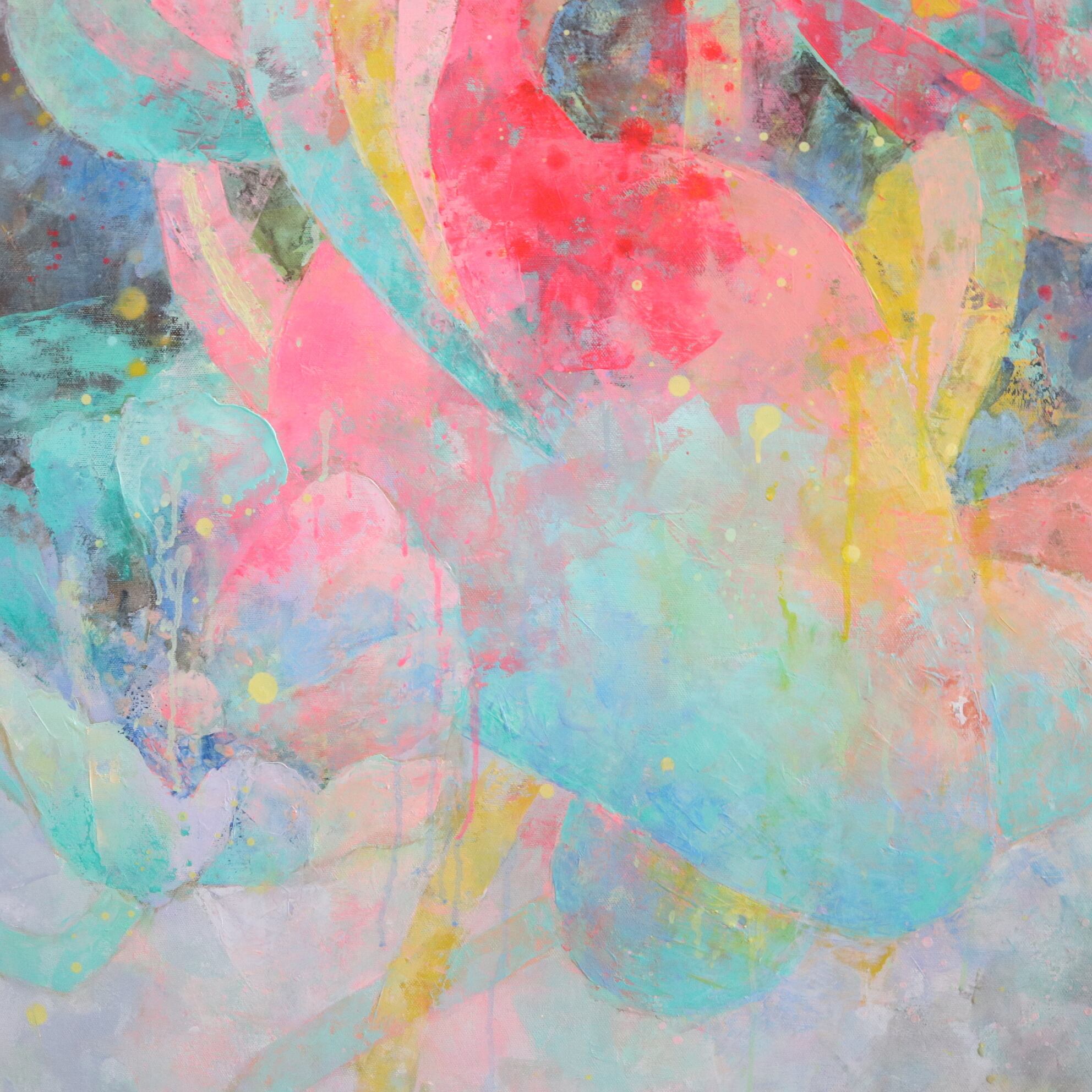 薄く溶いた油絵具を何層にも重ねて描き、最後にローラーを使い色を重ねて深みを出しました。色の重なりの美しさを感じていただけたら、嬉しいです。