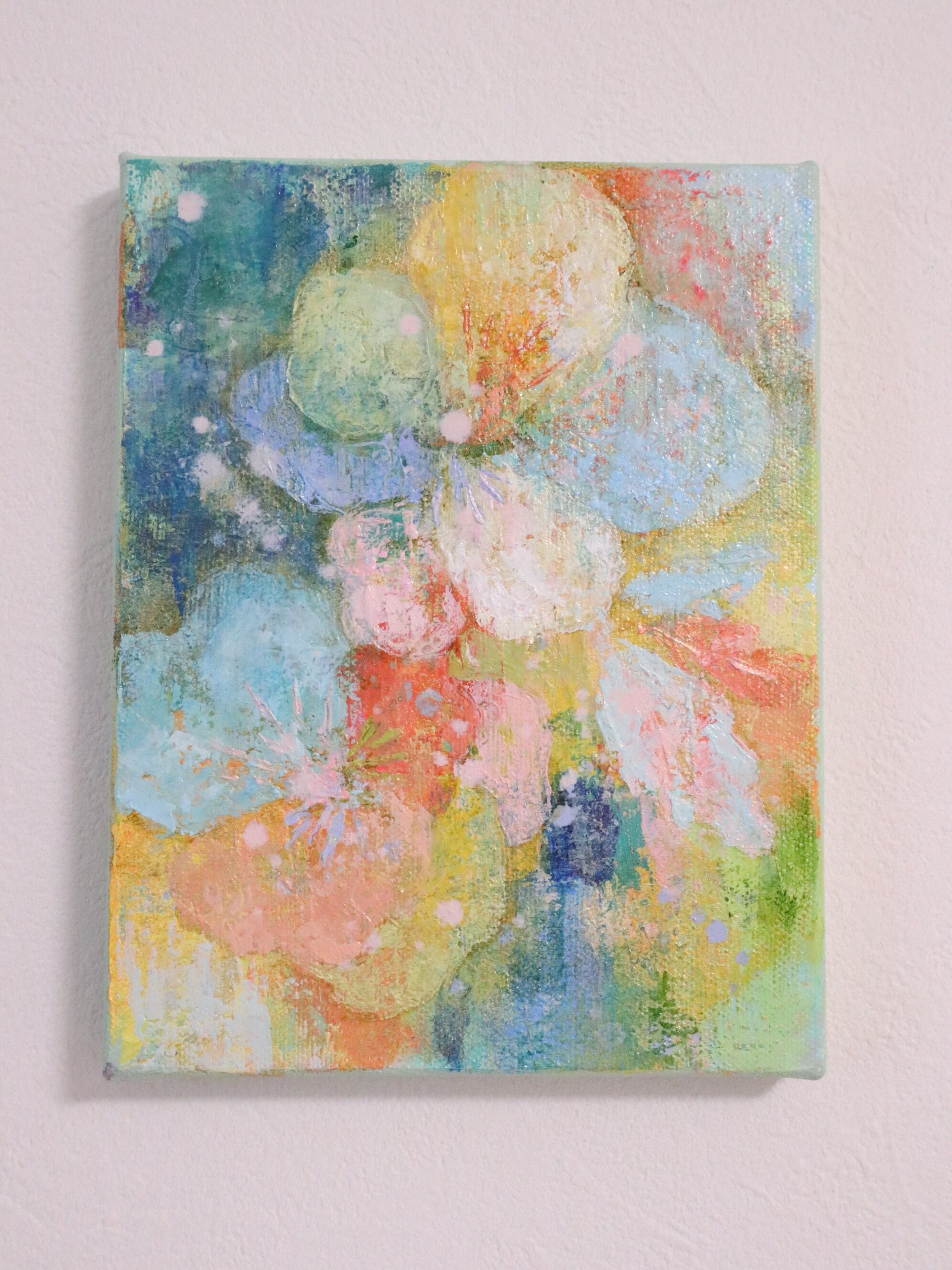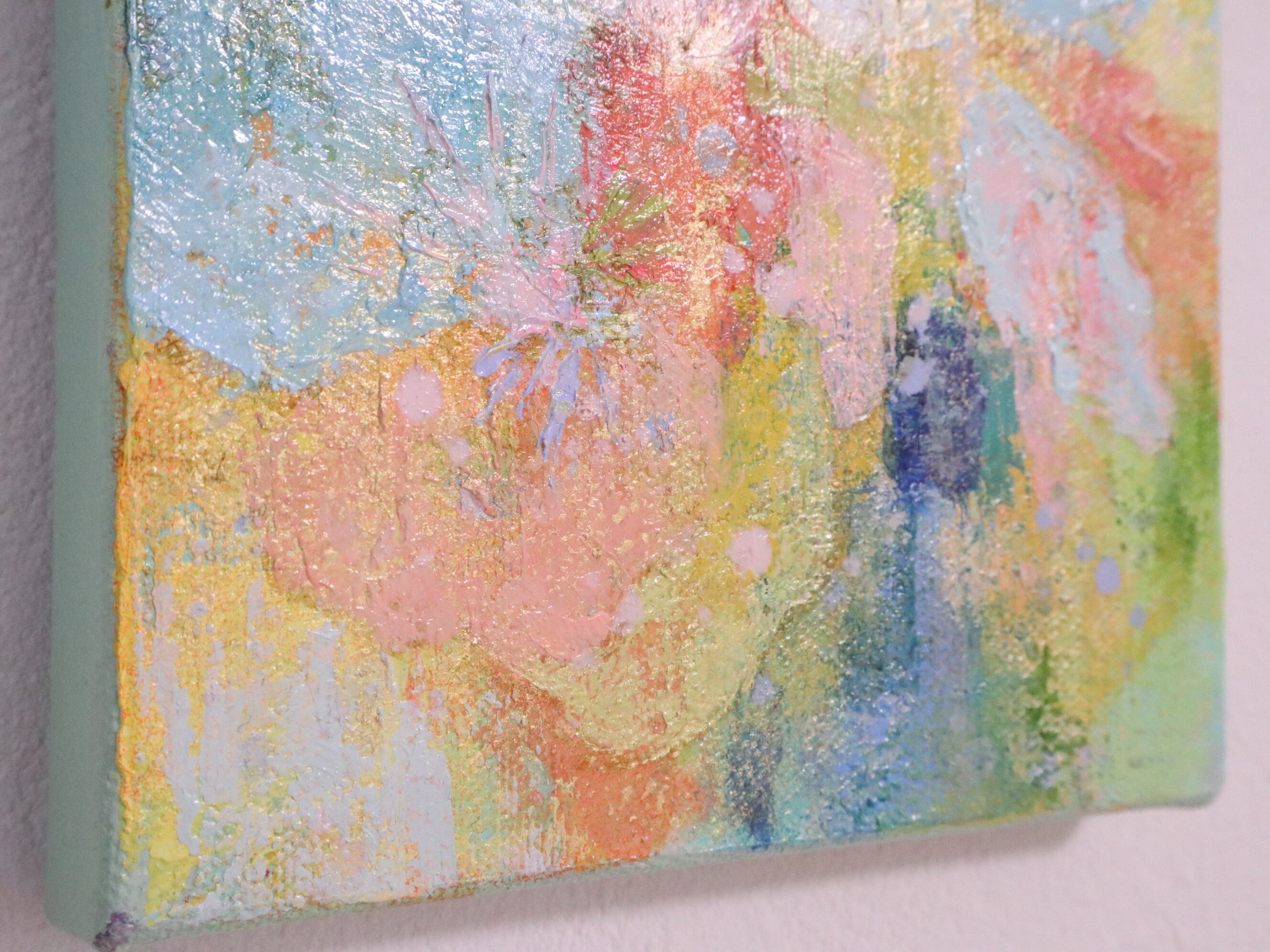 薄く溶いた油絵具を何層にも重ねて描き、金色の岩絵具を部分的に塗ってりますので控えめな輝きが綺麗です。色の重なりの美しさを感じていただけたら、嬉しいです。