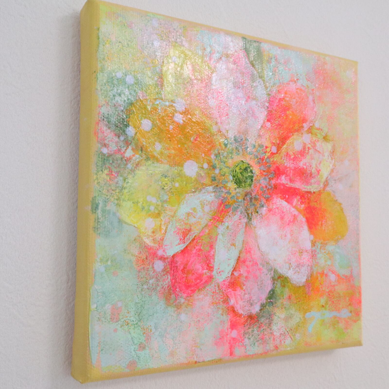薄く溶いた油絵具を何層にも重ねて描き、最後にローラーを使い色を重ねて深みを出しました。色の重なりの美しさを感じていただけたら、嬉しいです。