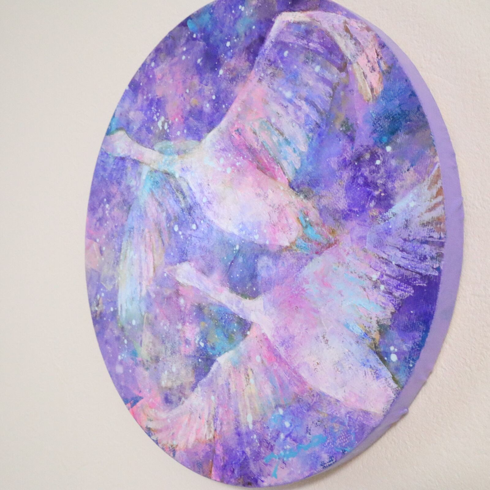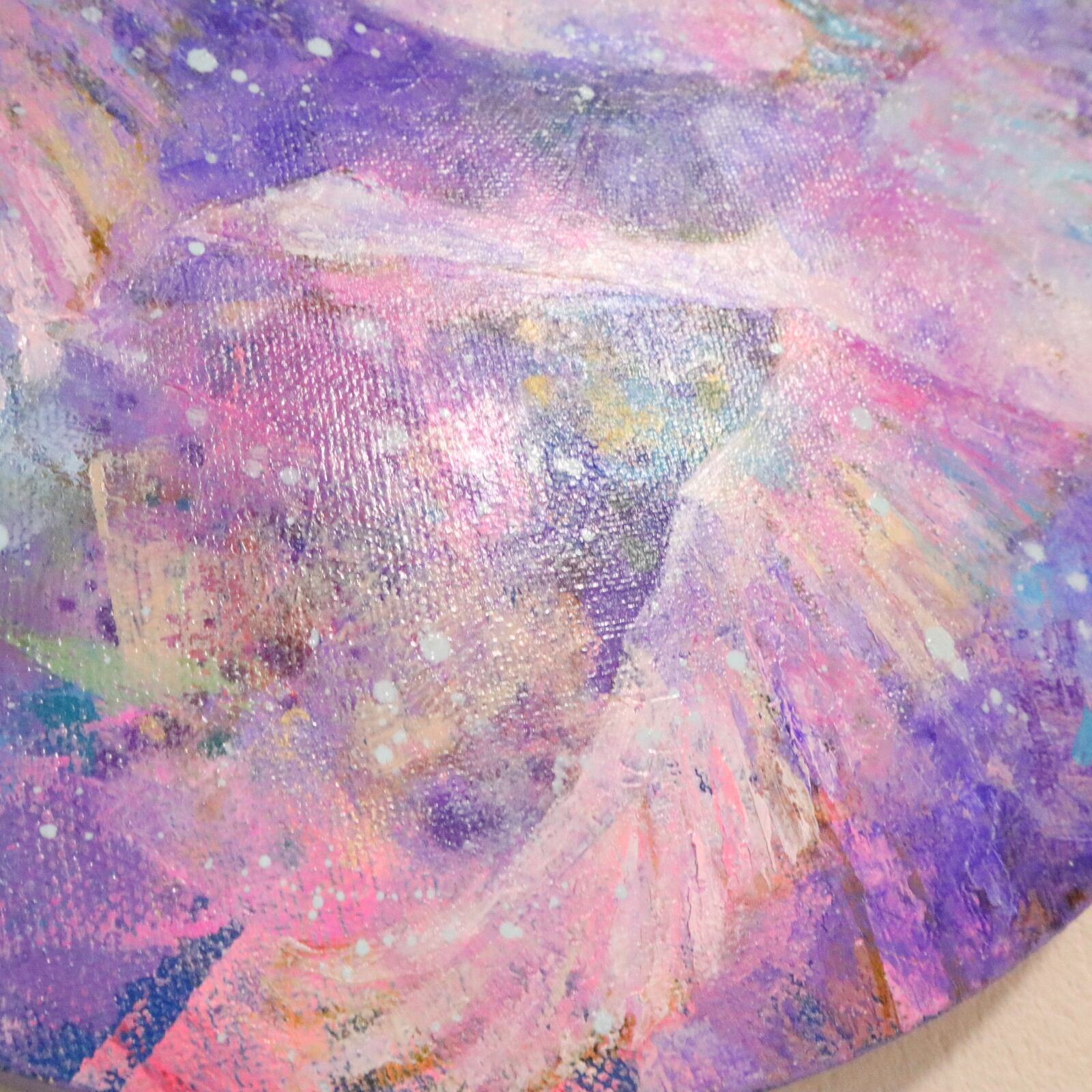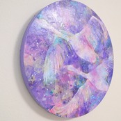 薄く溶いた油絵具を何層にも重ねて描き、最後にローラーを使い色を重ねて深みを出しました。色の重なりの美しさを感じていただけたら、嬉しいです。